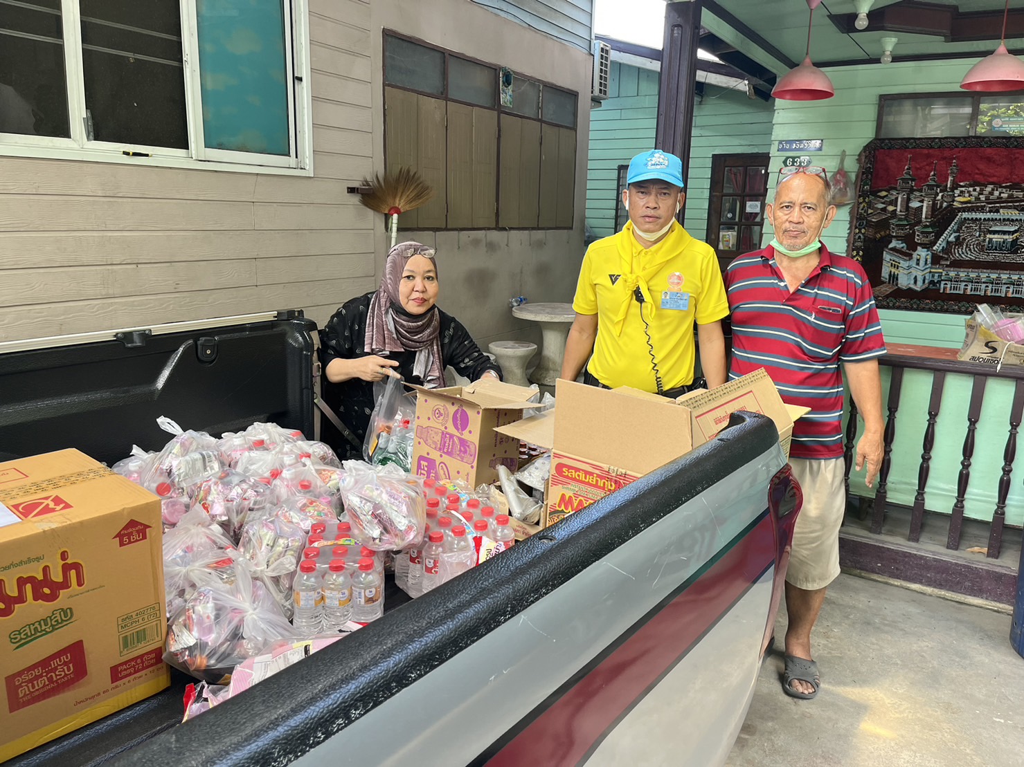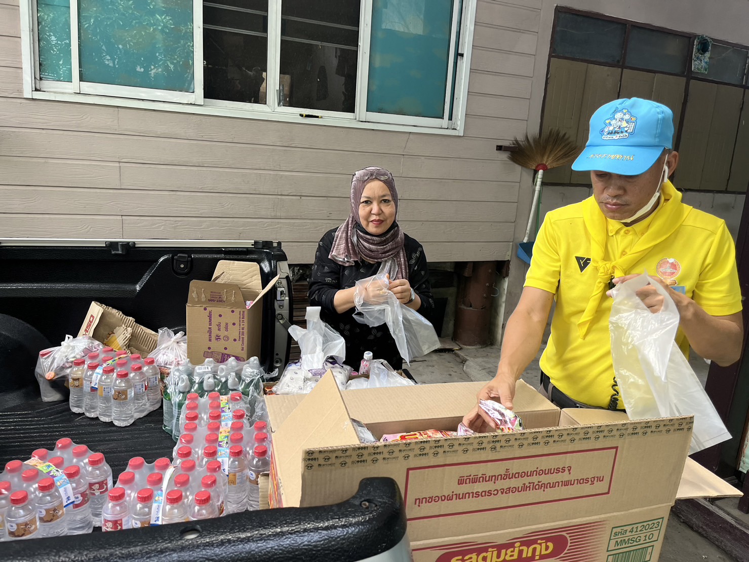 นาย รณรงค์ พลายกวม ประธานชุมชน ลำสาลีพัฒนาเป็นตัวแทนรับมอบสิ่งของเพื่อที่จะนำไปแจกจ่ายให้กับ ประชาชน ที่ได้รับความเดือดร้อน