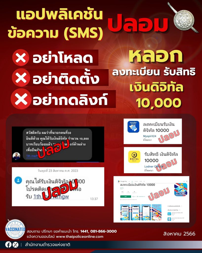 เตือนภัย มิจฉาชีพส่ง SMS แจ้งว่าได้รับ #เงินดิจิทัล 10,000 หลอกให้ติดตั้งแอปพลิเคชันปลอม ลวงลงทะเบียน รับสิทธิ กลโกงควบคุมโทรศัพท์ ดูดเงินจากบัญชี กองบังคับการตรวจสอบและวิเคราะห์อาชญากรรมทางเทคโนโลยี ตำรวจไซเบอร์ ตรวจสอบพบผู้เสียหายหลายได้รับข้อความสั้น (SMS) จากหมายเลขโทรศัพท์ที่ไม่ทราบแหล่งที่มาแจ้งว่า “ คณได้รับเงินดิจิทัล 10,000 บาท โปรดติดต่อเจ้าหน้าที่ ” พร้อมกับแนบลิงก์ให้เพิ่มเพื่อนทางแอปพลิเคชันไลน์ เมื่อผู้เสียหายติดต่อไปยังไลน์ดังกล่าว มิจฉาชีพจะหลอกลวงสอบถามข้อมูลเบื้องต้นว่าเป็นผู้มีสิทธิได้รับเงินดิจิทัลหรือไม่ จากนั้นจะให้ติดตั้งแอปพลิเคชัน “ ลงทะเบียนรับเงินดิจิทัล 10000 ” ผ่าน Play Store เมื่อทำการติดตั้งเสร็จสิ้น จะหลอกลวงให้ผู้เสียหายทำตามขั้นตอนต่าง ๆ เริ่มจากการให้ลงทะเบียนกรอกข้อมูลส่วนบุคคล ชื่อ-นามสกุล เลขประจำตัวประชาชน อาชีพ และรายได้ เพื่อตรวจสอบสิทธิ จากนั้นจะให้ตั้งค่าให้สิทธิการเข้าถึงโทรศัพท์มือถือ หรือการให้สิทธิควบคุมโทรศัพท์มือถือที่ผู้เสียหายใช้งานอยู่ หลอกลวงให้กรอกรหัส PIN 6 หลัก ที่ผู้เสียหายใช้งานอยู่เป็นประจำ รวมไปถึงหลอกลวงให้ทำการสแกนใบหน้า หรือหลอกลวงให้โอนเงินค่าธรรมเนียมในจำนวนเล็กน้อยเพื่อนำรหัสการทำธุรกรรมธนาคารของผู้เสียหายไปใช้แล้วเข้าควบคุมโทรศัพท์ของผู้เสียหายเพื่อโอนเงินออกจากบัญชี ด้วยความปรารถนาดีจากสำนักงานตำรวจแห่งชาติ