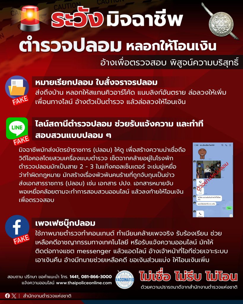 โปรดระวังมิจฉาชีพ 3 รูปแบบ “ตำรวจปลอม” หลอกให้โอนเงิน อ้างเพื่อตรวจสอบ แสดงความบริสุทธิ์ สำนักงานตำรวจแห่งชาติ #เตือนภัยออนไลน์ วายร้ายมิจฉาชีพออนไลน์ ใช้มุก “ปลอมเป็นตำรวจ” กับ 3 รูปแบบที่พบบ่อย 1.หมายเรียกปลอม ใบสั่งจราจรปลอม ส่งถึงบ้าน หลอกให้สแกนคิวอาร์โค้ด แนบลิงก์อันตราย ล่อลวงให้เพิ่มเพื่อนทางไลน์ อ้างตัวเป็นตำรวจ แล้วล่อลวงให้โอนเงิน 2.ไลน์สถานีตำรวจปลอม ช่วยรับแจ้งความ และทำทีสอบสวนแบบปลอม ๆ มิจฉาชีพมักส่งบัตรข้าราชการ (ปลอม) ให้ดู เพื่อสร้างความน่าเชื่อถือ วิดีโอคอลโดยสวมเครื่องแบบตำรวจ เซ็ตฉากคล้ายอยู่ในโรงพัก ตำรวจปลอมมักเป็นสาย 2 – 3 ในแก๊งคอลเซ็นเตอร์ จะข่มขู่เหยื่อ ว่าทำผิดกฎหมาย มักสร้างเรื่องพัวพันคนร้ายที่ถูกจับกุมเป็นข่าว ส่งเอกสารราชการ (ปลอม) เช่น เอกสาร ปปง. เอกสารหมายจับ พอเหยื่อคล้อยตามจะทำการสอบสวนออนไลน์ แล้วลงท้ายให้โอนเงินเพื่อตรวจสอบ 3.เพจเฟซบุ๊กปลอม ใช้ภาพนายตำรวจทำคอนเทนต์ ทำเนียนคล้ายเพจจริง รับร้องเรียน ช่วยเหลือคดีอาชญากรรมทางเทคโนโลยี หรือรับแจ้งความออนไลน์ …
