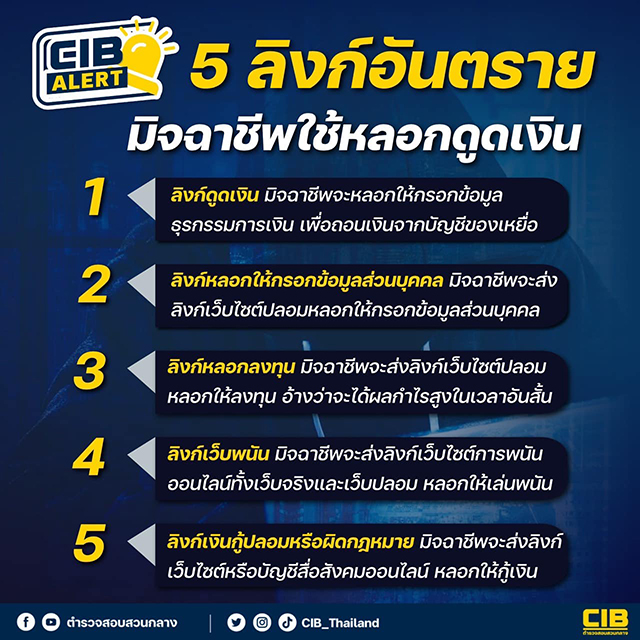 เตือนภัย 5 ลิงก์อันตราย มิจฉาชีพใช้หลอกดูดเงิน ปัจจุบันมิจฉาชีพมักหากลโกงใหม่ๆ มาใช้ในการหลอกลวงให้เหยื่อหลงเชื่อ โดยการนำลิงก์รูปแบบต่างๆ มาใช้เป็นเครื่องมือในการกระทำความผิด ซึ่งหากหลงเชื่อกดลิงก์ กรอกข้อมูล หรือติดตั้งแอปพลิเคชันจากลิงก์ดังกล่าว ก็จะทำให้ตกเป็นเหยื่อของมิจฉาชีพ ถูกดูดเงินออกจากบัญชีได้ โดยลิงก์ที่มิจฉาชีพมักนำมาใช้มี 5 รูปแบบ ดังนี้1.ลิงก์ดูดเงิน มิจฉาชีพจะหลอกให้กรอกข้อมูลที่เกี่ยวข้องกับธุรกรรมทางการเงิน หรือติดตั้งแอปพลิเคชันเพื่อทำธุรกรรมถอนเงินจากบัญชีของเหยื่อ โดยแอบอ้างเป็นเจ้าหน้าที่ของหน่วยงานราชการต่างๆ เช่น อ้างว่าได้รับเงินคืนมิเตอร์ไฟฟ้า เป็นต้น2.ลิงก์หลอกให้กรอกข้อมูลส่วนบุคคล มิจฉาชีพจะส่งลิงก์เว็บไซต์ปลอมที่มีรูปแบบคล้ายกับเว็บไซต์ของจริง หลอกให้กรอกข้อมูลส่วนบุคคล ข้อมูลบัญชีผู้ใช้ หรือรหัสผ่าน3.ลิงก์หลอกลงทุน มิจฉาชีพจะส่งลิงก์เว็บไซต์ปลอมหรือติดตั้งแอปพลิเคชันลงทุนปลอมหลอกให้ลงทุน อ้างว่าจะได้ผลกำไรสูงในเวลาอันสั้น มีการนำภาพนักธุรกิจหรือองค์กรธุรกิจที่ประสบความสำเร็จมาประกอบเพื่อเพิ่มความน่าเชื่อถือ4.ลิงก์เว็บพนัน มิจฉาชีพจะส่งลิงก์เว็บไซต์การพนันออนไลน์ ซึ่งจะมีทั้งเว็บไซต์จริงและเว็บไซต์ปลอม โดยหลอกล่อให้เข้าไปเล่นพนัน หากหลงเชื่อเข้าไปเล่น นอกจากจะเสียทรัพย์สินแล้ว ยังเป็นการกระทำที่ผิดกฎหมายอีกด้วย5.ลิงก์เงินกู้ปลอมหรือผิดกฎหมาย มิจฉาชีพจะส่งลิงก์เว็บไซต์หรือบัญชีสื่อสังคมออนไลน์ หลอกลวงให้โอนเงินค่าใช้จ่ายในการกู้เงินก่อน แต่ไม่ได้รับเงินจริง หรืออาจเป็นบัญชีของกลุ่มเงินกู้นอกระบบ เรียกดอกเบี้ยเกินอัตราและมีการทวงหนี้โดยผิดกฎหมายตำรวจสอบสวนกลาง (CIB) จึงขอเตือนภัยให้ระมัดวังมิจฉาชีพในลักษณะดังกล่าว ไม่กดลิงก์ที่ไม่ทราบแหล่งที่มา ไม่ให้ข้อมูลส่วนบุคคล ข้อมูลบัญชีธุรกรรมทางการเงิน และห้ามติดตั้งแอปพลิเคชันที่ไม่น่าเชื่อถือ เพื่อจะได้ไม่ตกเป็นเหยื่อของมิจฉาชีพครับทั้งนี้ หากท่านตกเป็นเหยื่อของมิจฉาชีพออนไลน์ สามารถแจ้งเข้ามาที่ศูนย์ AOC 1441 เพื่อทำการอายัดบัญชีคนร้าย และดำเนินคดีตามกฎหมายกับมิจฉาชีพ ขอบคุณข้อมูลจาก: …